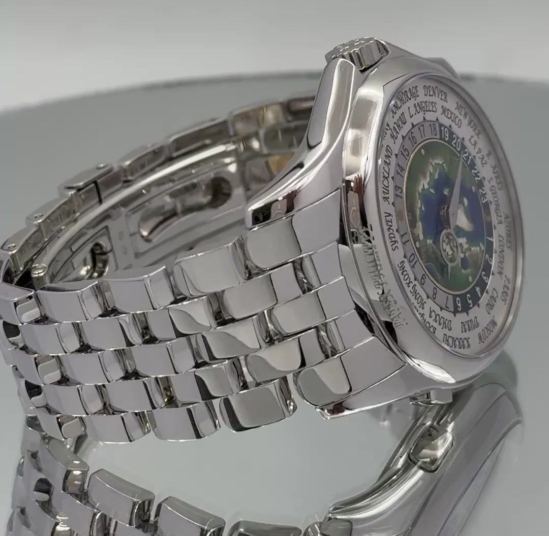 - 2017年~2020年まで製造されたプラチナ製のワールドタイムクロワゾネで、 最終2020年製のお時計になります。 若干の擦れはございますが状態の良い個体です。 現在装着されているブレスレットで1つだけ1.5コマ分のコマが装着されております。 それにより通常よりも微調整が可能で、より手首に馴染み装着感が増すでしょう。 1.5コマはオプションで購入できるもので、プラチナ製なのでコマ1つでも非常に高額になりますのでお得です。 世界地図がクロワゾネによって描かれており、Ref.5131/1P-001は北極から見た地図がクロワゾネにより描かれています。 クロワゾネとは非常に細い金のワイヤーをデザインに従って曲げて囲いを作った後に、異なった色の釉薬を何層にも重ねて塗り、何度も加熱し製作するといったエナメル文字盤の中でも非常に難度の高い技法です。 プラチナ製ですので、ケース6時位置にはダイヤモンド埋め込まれており、控えめながら輝いております。
